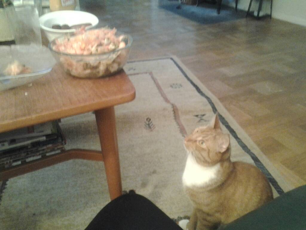 Så här går det när man får smaka en liten räka, eller tre ;-) Räkor är ju så himla gott så man vill gärna ha fler nu när husse och matte äntligen har ätit färdigt!! Jösses vad söt man kan vara!!